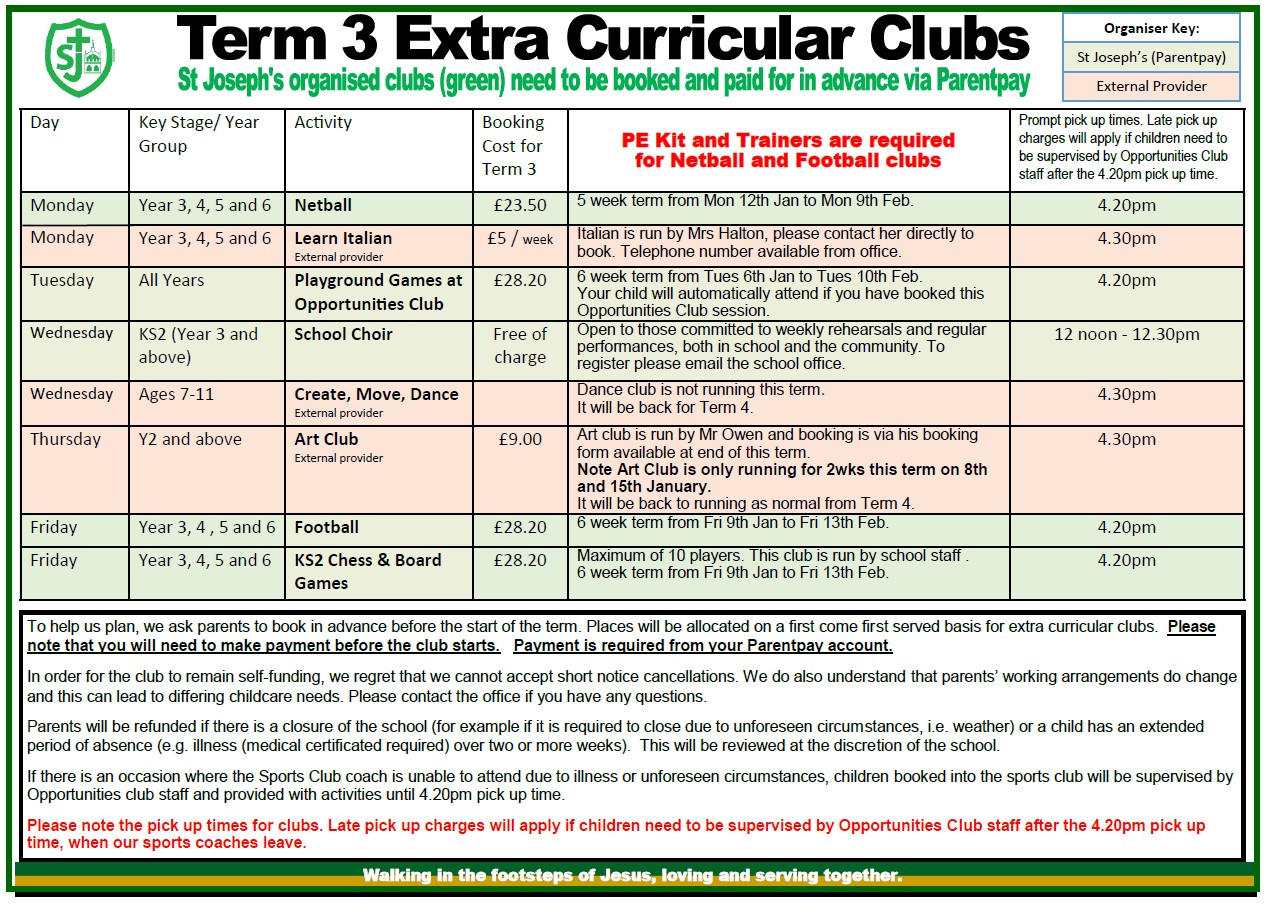 St Joseph’s offer extra curricular after school clubs throughout the week in term time. A timetable of clubs offered during Term 1 can be found below. Please note the difference between those organised by the school and those organised by an approved external provider. For St Joseph’s organised clubs please book by paying the associated item on Parentpay.