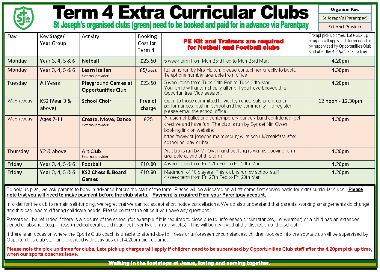 St Joseph’s offer extra curricular after school clubs throughout the week in term time. A timetable of clubs offered during Term 4 can be found below. Please note the difference between those organised by the school and those organised by an approved external provider. For St Joseph’s organised clubs please book by paying the associated item on Parentpay.