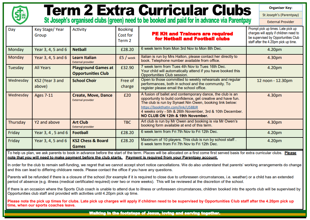 St Joseph’s offer extra curricular after school clubs throughout the week in term time. A timetable of clubs offered during Term 1 can be found below. Please note the difference between those organised by the school and those organised by an approved external provider. For St Joseph’s organised clubs please book by paying the associated item on Parentpay.