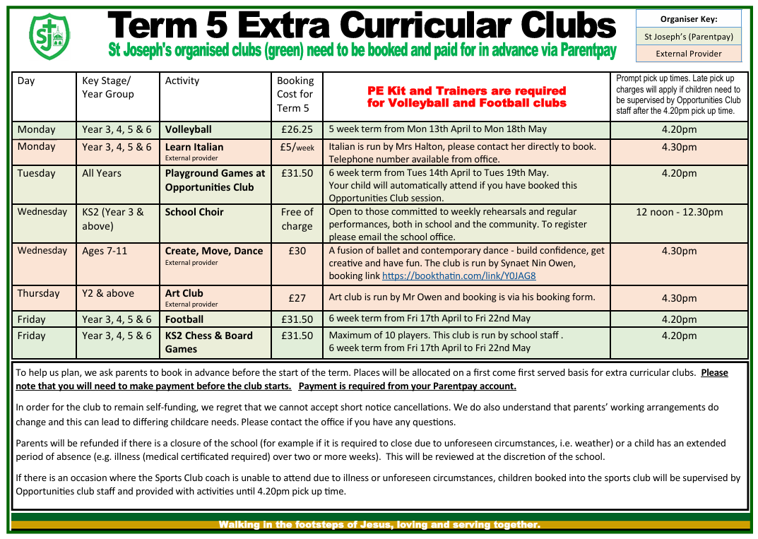 St Joseph’s offer extra curricular after school clubs throughout the week in term time. A timetable of clubs offered during Term 4 can be found below. Please note the difference between those organised by the school and those organised by an approved external provider. For St Joseph’s organised clubs please book by paying the associated item on Parentpay.